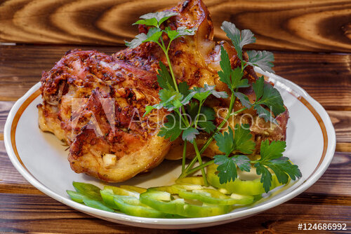 Промаринованную рульку очищаем (остатков чеснока быть не должно), обсушиваем-обтираем чистой салфеткой и шпигуем с обеих сторон кусочками зубчиков чеснока, разрезанных продольно. Сворачиваем мясо рулетом, в центр помещаем веточки зелени и перевязываем рулет в нескольких местах поварским шпагатом.