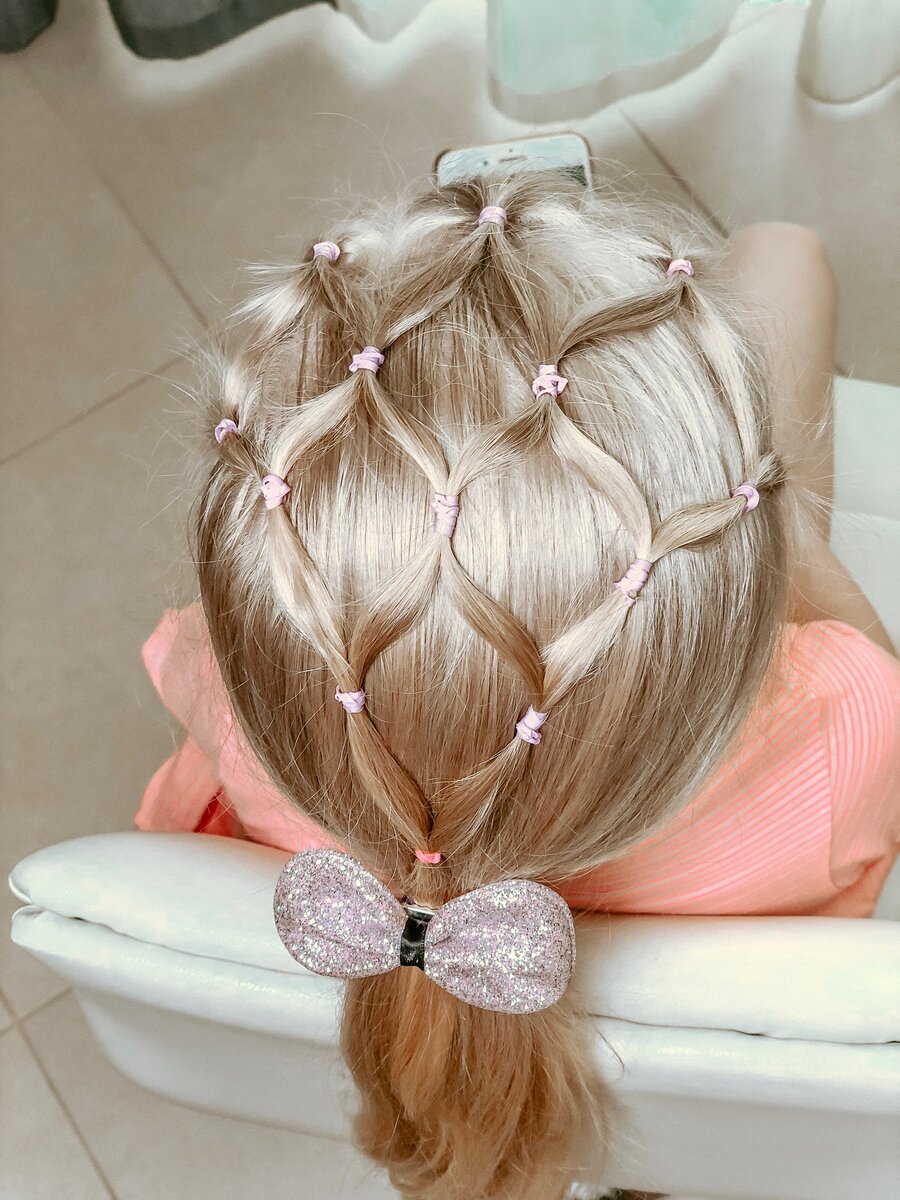 Следующий ряд точно также, крайную прядь с половиной следующей соединили резинкой, половину с половиной следующей соединили резинкой и половину с последней прядью соединили резинкой. И так до того момента, как останется один хвостик. Его соединяем с низким хвостом при помощи резинки. Прическа Паутинка готова. Чтобы не пропустить новые прически Подписывайтесь на наш You Tube канал Прически для девочек и заплетайте вместе с нами!!!