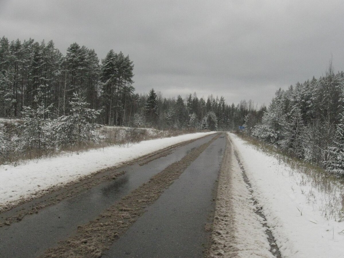И вот я стою на остановке на шоссе местного значения. Вокруг заснеженный лес и тишина - а всего в 70 километрах западнее снег едва-едва покрывал землю...