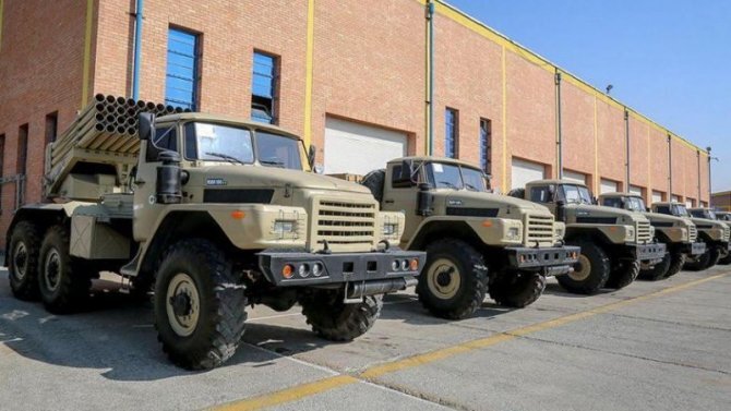 Иранская армия провела очередной строевой смотр, на который были допущены журналисты. Их ознакомили с образцами автомобильной техники, которая стоит на их вооружении, и образцы эти вызывают удивление. Например, на фото вверху прекрасно опознаются разработанные в СССР реактивные системы залпового огня «Град». Знакомо и их шасси — это грузовики «Урал-375» с колёсной формулой 6×6, кабины которых несколько переделаны в соответствии с требованиями современного дизайна. Таким тюнингом занимается иранская фирма KIAN. Помимо переделки кабин, она ставит в эти машины, названные KIAN-160, более современные дизели и КПП. Фирма также модернизирует бескапотные 3-осные тягачи Volvo FH, которые тут называют KIAN-500, и тяжёлые 4-осные «капотники» Volvo VN. Их тут называют KIAN-700 и используют в качестве танковых транспортёров. Кроме KIAN-160, иранская армия до сих пор использует доработанные советские бронетранспортёры «БТР-60ПБ», а также гусеничные боевые машины пехоты «БМП-1» и «БМП-2». Модернизаци