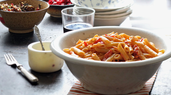 Penne alla vodka - идеальный рецепт для легкого приготовления: короткие макароны легче готовить в количествах, чем длинные пряди, а соус готовили ещё в 1960-е годы в Риме, где и возникло это блюдо. ИНГРЕДИЕНТЫ: * Соль * 1 чашка мелко нарезанного лука * 2 столовые ложки масла, настоянного на чесноке * 200 гр- мелко нарезанных свежих помидоров * 2 столовые ложки густых сливок * 2 фунта пенне(макарон) ригате * ½ стакана водки * 4 столовые ложки сливочного масла * Тертый сыр пармезан, для подачи Приготовление: 1. Доведите до кипения большую кастрюлю с слегка подсоленной водой. Положите большую сковороду на средний огонь и добавьте лук, масло и немного соли. Обжарить лук до мягкости и начать карамелизироваться около 10 минут. 2. Добавьте помидоры и их соки и тушите 15-20 минут. Добавить густые сливки и снять с огня. 3. Добавьте макароны в кипящую воду и варите до готовности. Слейте пасту и верните в кастрюлю. Добавить водку, масло и соль по вкус