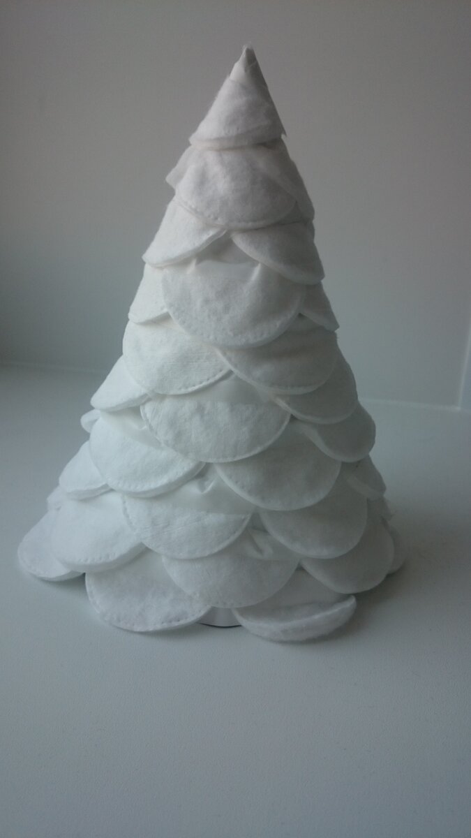 Когда приближается новый год, хочется создать вокруг себя атмосферу праздника и не только дома, но и на работе. Главный атрибут этого праздника – елка. Предлагаю вам своими руками сделать маленькую настольную елочку. Учитывая материалы, затрачиваемые на изготовление поделки можно понять, что себестоимость такой елки – сущие копейки. Сначала берем лист бумаги и сворачиваем конусом. Я взяла рекламную листовку, которая была из плотной бумаги: Закрепляем получившийся конус широким скотчем: Ножницами обрезаем неровные края внизу конуса так, чтобы он мог ровно стоять на столе. Затем берем ватный диск и разрезаем пополам. Получившиеся половинки диска приклеиваем ровным краем к скотчу. Начиная снизу конуса, по кругу наклеиваем скотч. Наклеивая следующий ряд дисков стараемся, чтобы он ложился сверху между дисков предыдущего ряда. Таким образом, обклеиваем весь конус. Вот такая удивительно нежная (снежная) елочка получилась: Ею можно украсить компьютерный столик, подоконник, кухонный