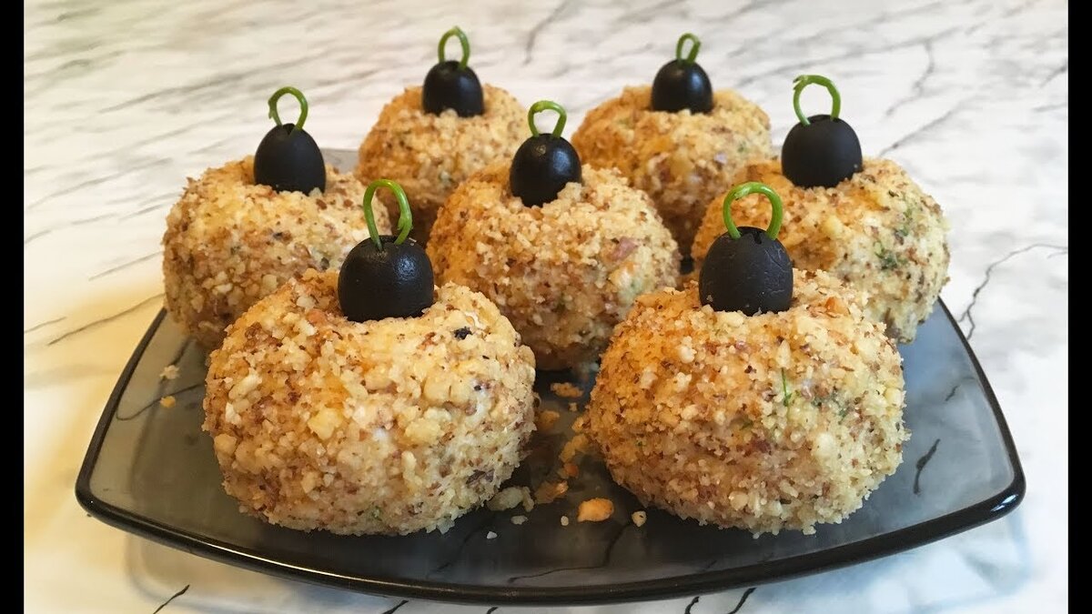 1. Куриное филе и яйца отварить до готовности и остудить. 2. В миске смешать мелко нарезанное мясо и тертые яйца. 3. Добавить тертый сыр, мелко нашинкованный укроп. 4. Добавить майонез и прессованный чеснок. Хорошо перемешать. 5. Орехи измельчить. 6. Ложкой набрать салатную массу в середину уложить маслину, сформировать шарик и обвалять в орехах. 7. Выложить на блюдо шарики. 8. Оформить в виде елочных шаров. 9. Закуска «Елочные шары» готова.