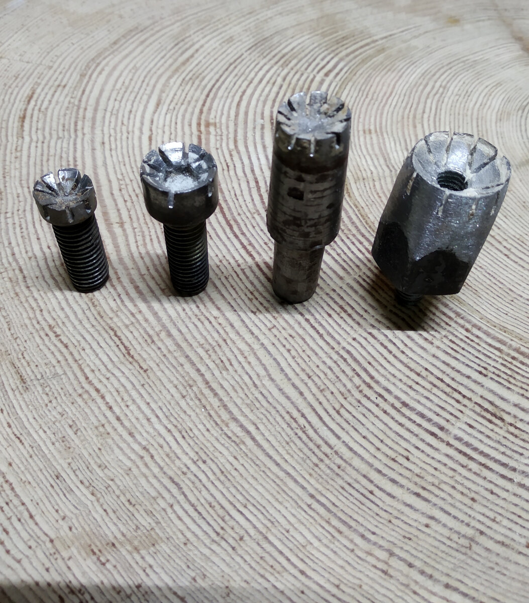 Такие самодельные полукруглые фрезы, хоть и не часто, но бывают нужны тем, кто занимается резьбой по дереву. С их помощью, можно быстро сделать имитацию различных полукруглых деталей - пуговицы, кнопки, зрачки глаз. В продаже таких фрез я не нашёл, по этому делал их сам. Две первые фрезы сделаны из обычных болтов М10 под шестигранник. В шляпке болта делал сверление, после чего ручной ножёвкой по металлу делал пропилы на глубину 5мм. Получается некоторое подобие зубьев. После работы таких фрез, выходят полусферы диаметром 12 и 16мм. Следующие фрезы для диаметров 14 и 20мм. Правая фреза сделана из шестигранника по той же технологии, но после сверления, внутренняя рабочая поверхность дополнительно шлифовалась круглой абразивной шарошкой, благодаря чему, полусфера получается более качественной. Работа с такими фрезами имеет некоторые особенности. Фрезу зажимаем в дрель, устанавливаем максимальные обороты и подводим к заготовке не перпендикулярно, а под небольшим углом, чтобы фреза н