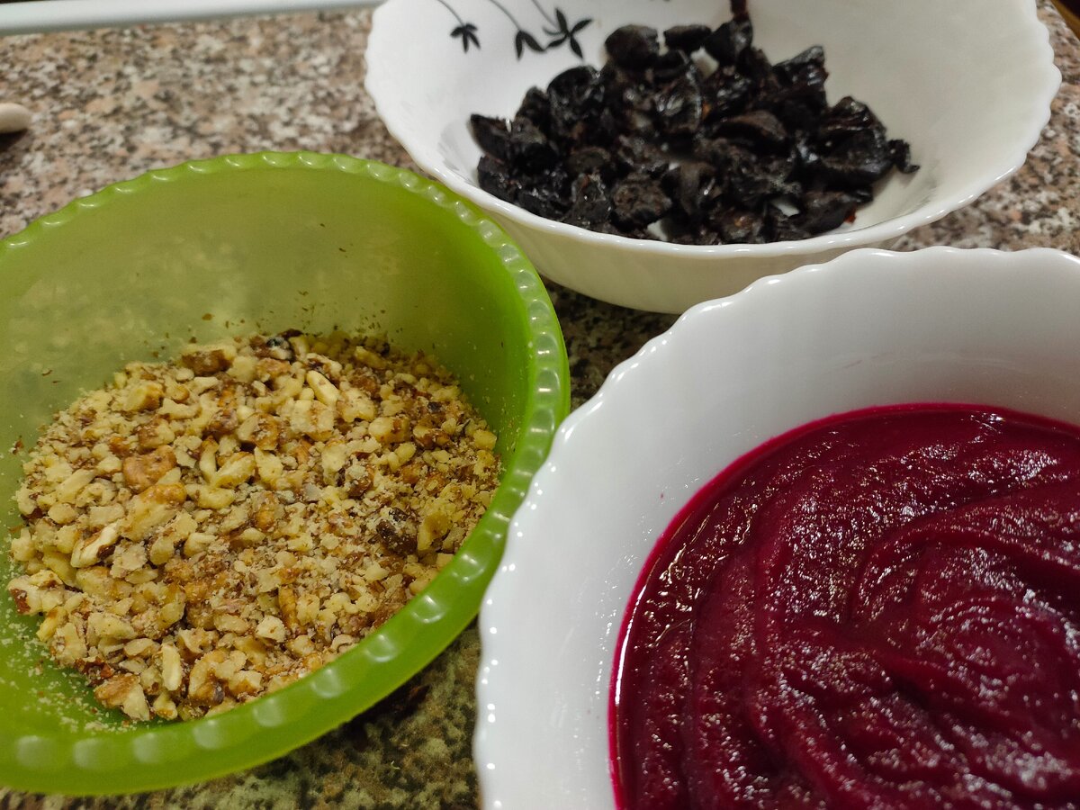 Всем привет, дорогие читатели и подписчики! Хочу представить вашему вниманию свекольный хлеб. Прежде чем приступим к замесу и выпечке, пробежимся по основным ингредиентам. - свекла Моем и запекаем при температуре 190 С до готовности (нож легко протыкает до середины). Или отвариваем. Но настоятельно рекомендую первый вариант. Затем чистим, мелко нарезаем и взбиваем ручным блендером в пюре. -грецкие орехи Слегка обжариваем на сковороде и измельчаем скалкой, молотком и т.п. -чернослив - без косточки. Запариваем в горячей воде на 10-15 минут. Сливаем воду, режем каждую сливу на 4 части. Рецепт мука пшеничная - 500 гр. пюре из свеклы - 350 гр. чернослив - 100 гр. грецкий орех - 70 гр. соль - 3 гр. сахар - 12 гр. масло растительное - 7 гр. дрожжи сухие - 5 гр. вода - 100 гр. Замес В теплой воде растворяем