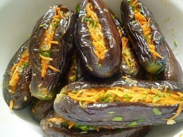 Фаршированные баклажаны. Надёжный рецепт! Баклажаны – 10 шт. Перец – 3 шт. Морковь – 2 шт. Чеснок – 3 головки Петрушка – 1 пучок Для маринада: Соль– 2,5 ст.л. Сахар – 2,5 ст.л. Уксус 9 %– 3 ст.л. Растительное масло – 5 ст.л. Душистый перец горошек – 10 шт. Лавровый лист – 3 шт. Морковь натереть на тёрке. Перец нарезать тонкой соломкой. Чеснок пропустить через пресс. Петрушку порубить. Тщательно смешать все подготовленные ингредиенты и оставить на 1,5 часа. Баклажаны отварить в подсоленной воде 5-10 минут до мягкости, тщательно отжать под прессом, разрезать вдоль до половины, начинить каждый баклажан начинкой и уложить готовые баклажаны в банки плотно. Приготовить горячий маринад. Залить маринадом баклажаны, закатать, перевернуть, укутать, оставить до полного остывания. Баклажаны будут готовы через 1 месяц.