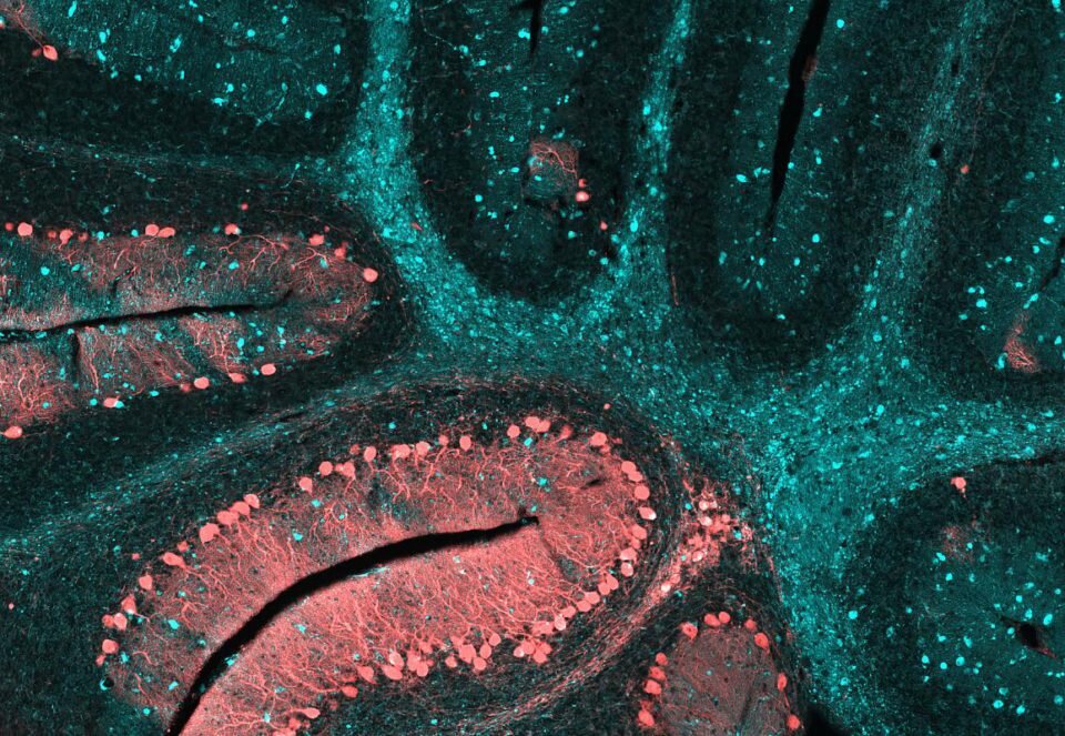 Мозжечок с признаками нейродегенеративной патологии, которая носит название болезни Ниманна-Пика. Здесь наблюдается тип C (NPC), причём, в конечной стадии заболевания. Это наследственный недуг, который имеет аутономно-рецессивный тип наследования и характеризуется накоплением в клетках липидов из-за нарушений липидного метаболизма. При типе С происходят мутации генов NPC1 или NPC2, которые отвечают за белок клеточной мембраны, транспортирующий холестерин и липиды внутрь клетки. Проявляется он как у маленьких детей, так и у взрослых, часто сопровождается задержками в развитии, повышенным мышечным тонусом, нарушением координации движений и некоторыми другими проявлениями. Бирюзовым цветом показаны плотные очаги скопления липидов в головном мозге. Учёные Национального центра по продвижению трансляционных исследований и Национального института детского здоровья и развития человека Юниса Кеннеди Шрайвера активно проводят исследования для того, чтобы усовершенствовать методы лечения NPC и д