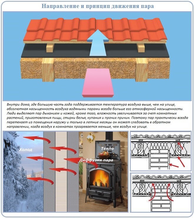Объясняя доступным языком, можно представить процесс работы изоляции следующим способом. Сначала пар попадает на паронепроницаемую пленку. Она задерживает влагу, и за нее попадает лишь незначительно количество воды. Остатки влажности проходят через утеплитель, который в силу своих характеристик, легко передает влагу выше. Там уже слой гидроизоляции выводит воду наружу.