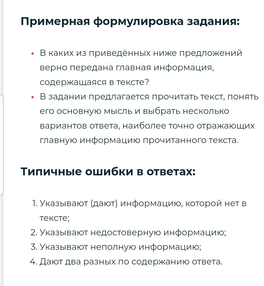 Урааа! Первое испытание за плечами🎉 А сегодня мы с вами будем разбирать 2 первых задания в экзаменнационных тестах по русскому языку! Начнём с первого 1️⃣ задания. АЛГОРИТМ РЕШЕНИЯ , КОТОРЫЙ НЕОБХОДИМО ВЫПОЛНИТЬ!!! 1. Внимательно прочитайте текст. 2. Определите, какая информация в тексте является основной, а какая – второстепенной. 3.Подчеркните в каждом предложении ключевые слова, важные для понимания того вопроса, который затрагивается автором. 4. Обратите особое внимание при графической обработке текста на 2 и 3 предложения: это, как правило, смысловой центр текста. 5.Прочитайте варианты ответов, исключите суждения, которые содержат: 📔второстепенную информацию 📔фактические и логические ошибки 📔искаженную информацию 6. Найдите 2 предложения, в которых главная информация передана верно. Задание номер2️⃣ 1.Внимательно прочитайте текст 2.Установите логическую связь между частями текста, которые соединены пропущенными словом 3 Подберите пропущенное слово так, чтобы с