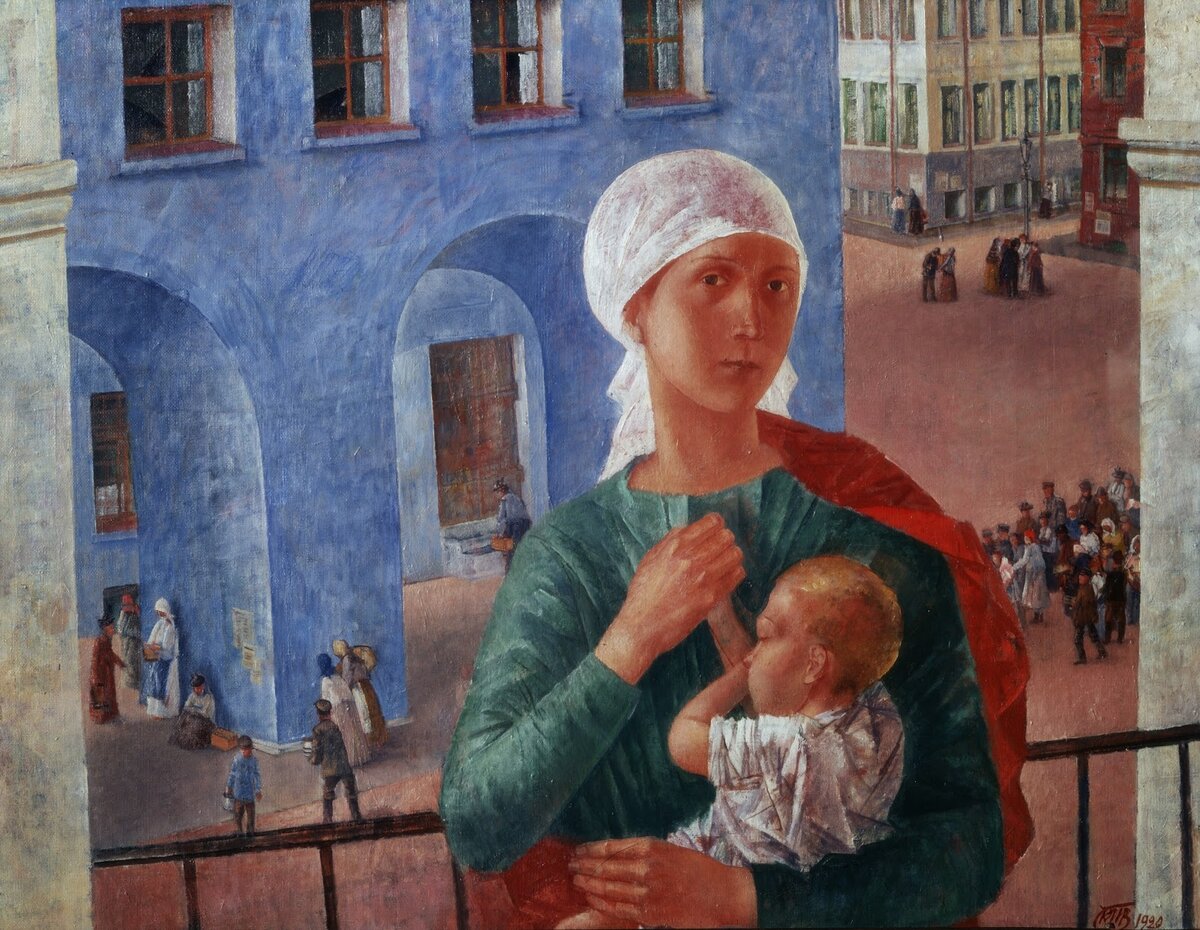 «1918 год в Петрограде» (1920) — одна из самых запоминающихся и значимых картин К.С. Петрова-Водкина. Выставленная в Третьяковке, она больше известна под негласным названием «Петроградская Мадонна». Именно эту работу критики называют «отражением эпохи» и «историческим символом» Революции. «Петроградская Мадонна» — это лицо, настроение революционной столицы. Сюжет, поражающий одновременно и простотой, и реалистичностью. Главная героиня — молодая женщина. Ее голова повязана белым платком, в глазах — тревога и смирение. И кажется, что это не лицо обычной горожанки, а иконописный лик. На руках у молодой матери — мальчик, прильнувший к груди. Его личика не видно, но зритель может быть уверен, что малыш — ровесник Красной Революции 1917 года. Фигуры матери и дитя на фоне города символичны. В этом простом собирательном образе художник объединил всех беззащитных, растерянных женщин и детей, которые могли только смириться с происходящим. Критики находят, что Петроградская Мадонна — не только л