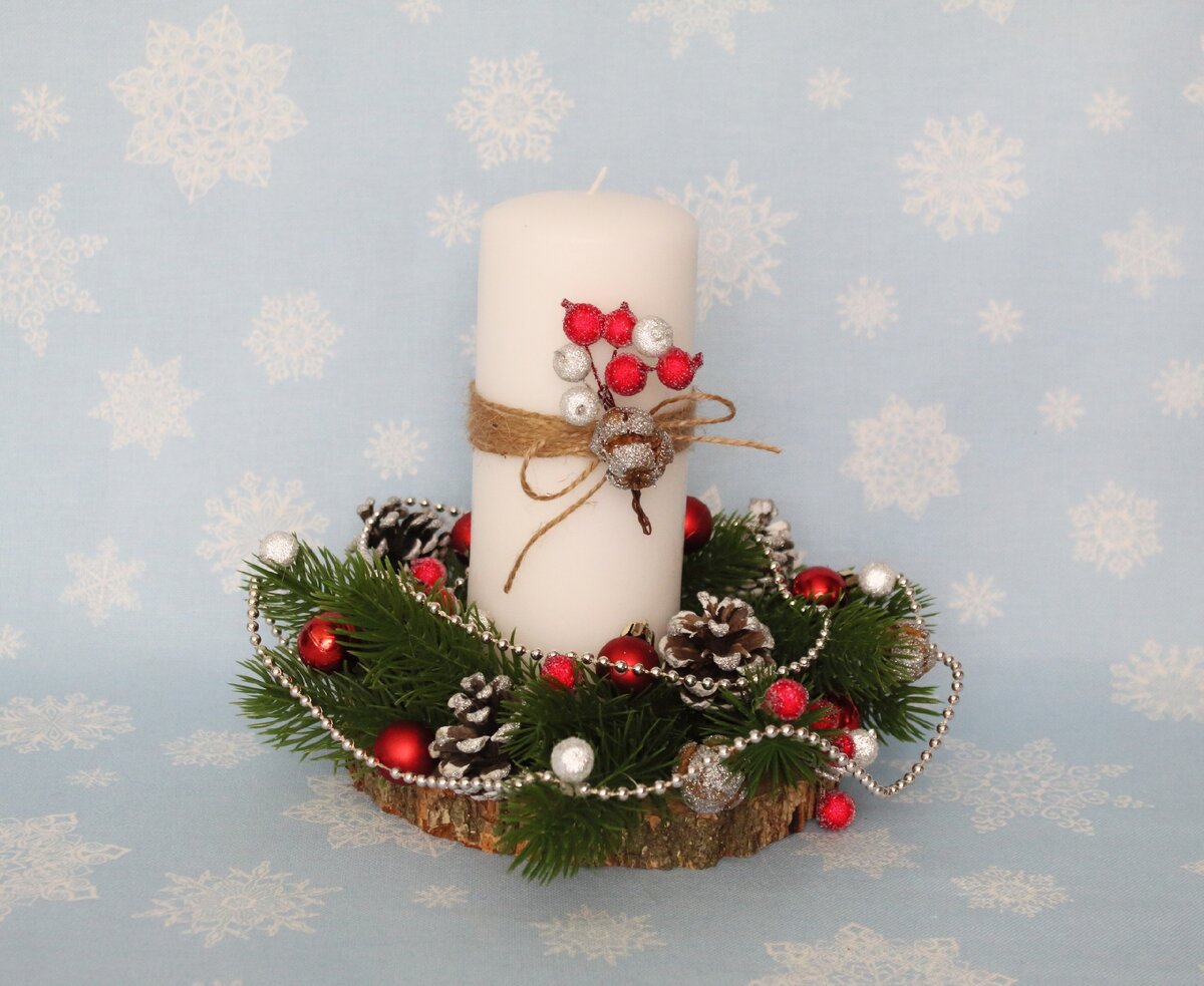 Добрый день, дорогие читатели! Сегодня, мне хотелось бы предложить Вам, создать замечательную композицию для новогоднего оформления. Материалы и техника на столько просты, что даже справится ребенок. Итак начинаем! Нам понадобиться: 1.Спил дерева для основы (можно найти в магазинах рукоделия, либо попросить мужа), если спил найти все же не удалось - подойдет любая деревяшка, фанерка... 2. Природный декор - шишки сосновые, шишки туи, возможно маленькие спилы, веточки интересной формы 3. Елочные игрушки небольшого диаметра 4. Искусственные еловые веточки 5. Ленточки, веревки, сахарные ягодки и все что Вам нравится для украшения композиции 6. Так же нам понадобится термо клей, полимерный клей (в строительных магазинах Дракон,Титан), ножницы и хорошее настроение Для начала мы устанавливаем свечу по центру спила и вокруг выкладываем еловые веточки, так чтобы Вам нравилось. Приклеиваем на термо клей веточки. Далее нам нужно приклеить свечу. Единственный клей,на который я смогла приклеить