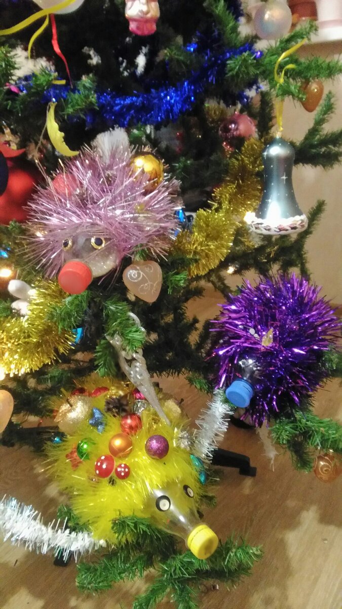 А вот и обещанные ёжики~поделки из бутылочек. История о том, как появился первый новогодний ёжик здесь :) Делаются они не сложно. Берётся пустая бутылочка из под воды, большая или маленькая, обклеивается мишурой, лучше на термо клей, и украшается ёлочными игрушками. Лапки делаются из любого материала и подклеиваются снизу, для устойчивости. Глазки можно из пуговичек сделать или купить специальные. Внутрь бутылочки можно насыпать бусинки, чтобы было веселей ) Очень смешные и яркие получаются ёжики. Их можно посадить и на новогодний стол и под ёлочку. Но лучше, конечно, отдельно от ёлочки, потому что такие ежи сами похожи на ёлку! ) Цветущий май и новогодний ёж #поделки на новый год #поделки с детьми