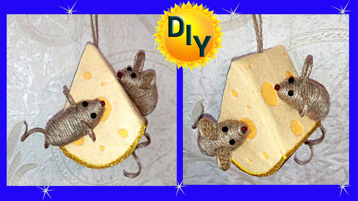 Делаем новогоднюю елочную игрушку с символом года.Мышка на сыре - это отличная поделка в школу . Делается просто и легко . Вырезаем из картона форму сыра, делаем к нему боковины. Берем фетр желтого цвета, два оттенка, и темным обклеиваем форму сыра. В светлом вырезаем кружочки и приклеиваем по верх темного фетра. Имитируемым сыр. Делаем корочку из глитерного фоамирана. Делаем мышку из кусочка пенопластовой трубы (можно из фольги, пробки ) В подсказках есть ссылка на видео где делаю из фольги. Обклеиваем ее джутом. Для приклеивания используем двухсторонний скотч. Так как труба плавится от клеевого пистолета. Делаем ушки из мешковины. Пропитываем ее клеем ТИТАН, чтоб она стала жесткой. Из бисера или перца горошка делаем глазки и носик. Приклеиваем на сыр наших мышек. Поделка в школу готова. С наступающим Новым годом и рождеством!!! Еще много разных видов символа года и по Китайскому и по Славянскому календарю можно посмотреть на канале