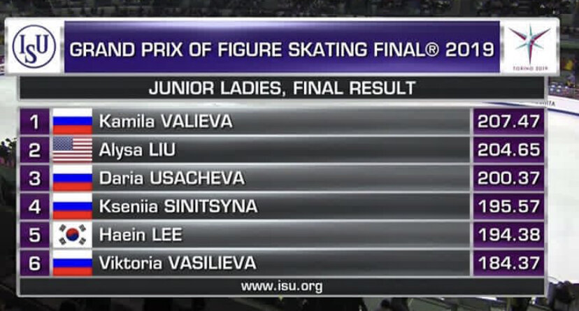 Дорогие читатели, меня просто переполняют эмоции. Только что закончили свои соревнования девушки. И да, Камила Валиева стала чемпионкой финала чемпионской серии Гран-При по фигурному катанию сезона 19/20. Это невероятная фантастика! Итоговые результаты выглядят так: К сожалению, не все получилось у Виктории Васильевой и Ксении Синицыной в произвольных программах. Для себя я все же выделю Ксюшу, она для меня стала очень приятным открытием. Красива и выразительна. Все ещё впереди, дорогие девушки. Вы знаете, к своему стыду, я была в шоке, когда увидела контент Алисы. Я предполагала, что Лью в своём стиле накрутит свои так называемые элементы ультра-си и получит высокие баллы от судей, которые обычно моргают все ее недокруты. Но нет, два неуверенных квад-лутца, падение с сольного трикселя и более менее выполненный 3А+2Т. Недокрутов было много даже на тройных прыжках. Дарья Усачева заняла третью позицию. Вы знаете, я считаю, что этой фантастичной девочке уделено слишком мало внимания со с