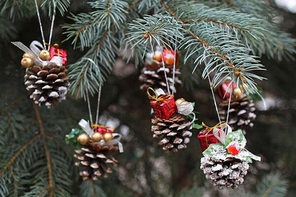 Сосновые шишки очень популярный материал для новогоднего декора. Красиво, по-праздничному, оформленные шишки можно использовать в качестве игрушки для елки, для украшения рождественского венка или настольной композиции со свечой и елочными шариками. Необходимые материалы: Окрашивание шишки Сначала необходимо окрасить шишку. Клей ПВА нужно смешать со строительным гипсом и белым грунтом (акриловой краской). Получится белоснежная клеящаяся масса. Если смесь получается слишком густой, можно добавить воду. По консистенции смесь для окрашивания должна напоминать сметану. Обмакивая губку в смесь, окрасить шишку точечными движениями. Шишка на глазах становится как-будто объемной. После того, как шишка высохла, нужно сделать петельку для подвешивания. Для этого отрезать кусочек шпагата нужной длины, из декоративной красной ленты шириной 2,5 сантиметра сформировать бантик, и затянуть или завязать шпагат на бантике. Декор для шишки В качестве украшения шишки можно использовать различный декор. Н