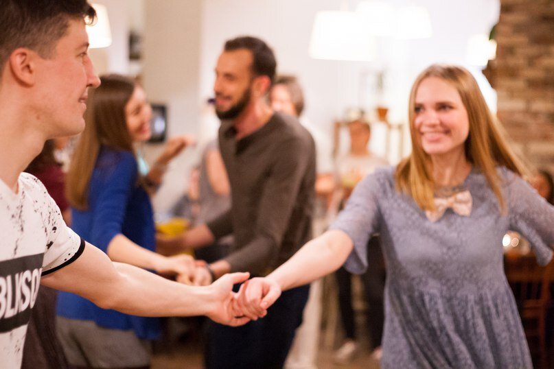 Скачущие вприпрыжку, скользящие, неуверенные, четкие, игривые, смелые и ошибающиеся шаги. Меня надолго увлекло наблюдение за ногами. Взгляд змейкой ходил по залу или в точности повторял траекторию движения одной пары, но какой-нибудь веселый «носочек» перехватывал мой взор и я перемещалась за ним.