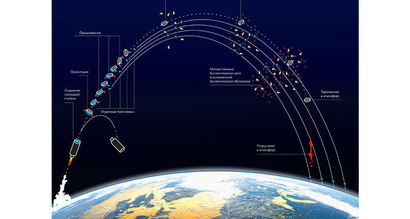 Полезная нагрузка межконтинентальной баллистической ракеты большую часть полета проводит в режиме космического объекта, поднимаясь на высоту, в три раза больше высоты МКС. Огромной длины траектория должна быть просчитана с особой точностью. После отделенных боеголовок наступает черед других подопечных. В стороны от ступени начинают разлетаться самые забавные штуковины. Словно фокусник, выпускает она в пространство множество надувающихся воздушных шариков, какие-то металлические штучки, напоминающие раскрытые ножницы, и предметы всяких прочих форм. Прочные воздушные шарики ярко сверкают в космическом солнце ртутным блеском металлизированной поверхности. Они довольно большие, некоторые по форме напоминают боеголовки, летящие неподалеку. Их поверхность, покрытая алюминиевым напылением, отражает радиосигнал радара издали почти так же, как и корпус боеголовки. Наземные радары противника воспримут эти надувные боеголовки наравне с реальными. Разумеется, в первые же мгновения входа в атмосферу эти шарики отстанут и немедленно лопнут. Но до этого они будут отвлекать на себя и загружать вычислительные мощности наземных радаров — и дальнего обнаружения, и наведения противоракетных комплексов. На языке перехватчиков баллистических ракет это называется «осложнять текущую баллистическую обстановку». А всё небесное воинство, неумолимо движущееся к району падения, включая боевые блоки настоящие и ложные, надувные шарики, дипольные и уголковые отражатели, вся эта разношерстная стая называется «множественные баллистические цели в осложненной баллистической обстановке». Металлические ножницы раскрываются и становятся электрическими дипольными отражателями — их множество, и они хорошо отражают радиосигнал ощупывающего их луча радара дальнего противоракетного обнаружения. Вместо десяти искомых жирных уток радар видит огромную размытую стаю маленьких воробьев, в которой трудно что-то разобрать. Устройства всяких форм и размеров отражают разные длины волн. Кроме всей этой мишуры, ступень теоретически может сама испускать радиосигналы, которые мешают наводиться противоракетам противника. Или отвлекать их на себя. В конце концов, мало ли чем она может быть занята — ведь летит целая ступень, большая и сложная, почему бы не нагрузить ее хорошей сольной программой?