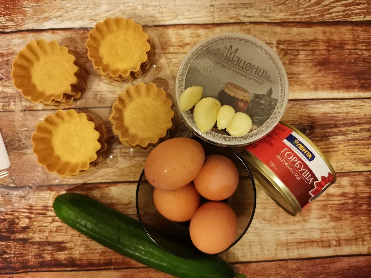 Теперь раскладываем нашу смесь по тарталеткам или кусочкам хлеба (их можно предварительно поджарить в тостере или на сковороде). Украсим долькой огурчика и помидорки