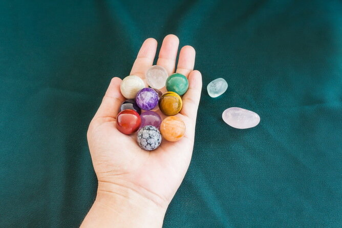 Материал: коллекция камушков, состоящая из минералов, бусин, шариков, бисера, морских камней и раковин, пластмассовых и стеклянных элементов.