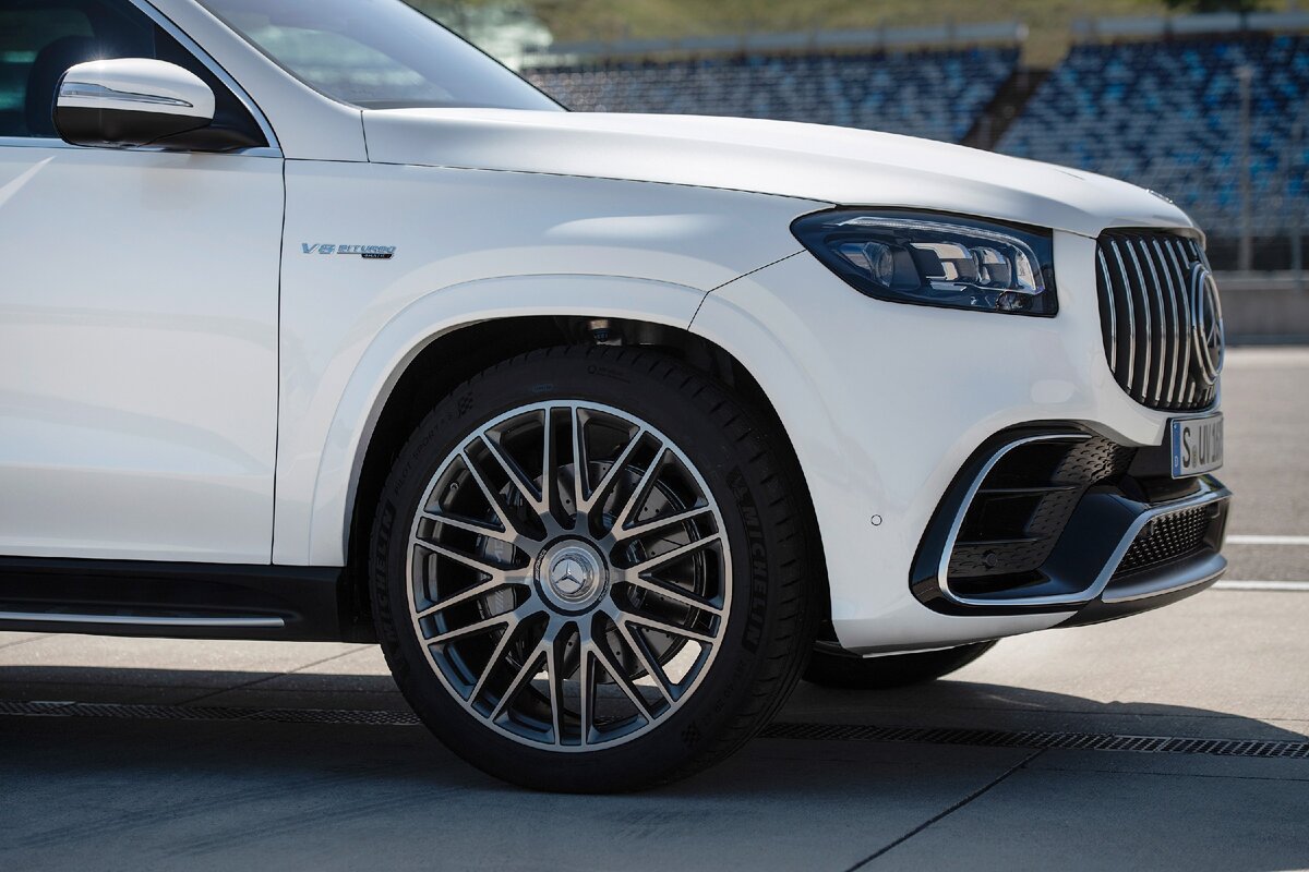 Расширители колёсных арок, облицовка порогов и корпуса наружных зеркал окрашиваются в цвет кузова, молдинг по периметру бокового остекления получает глянцевое хромированное покрытие. По-новому оформленный, подчёркивающий ширину кузова задний бампер AMG со спортивным диффузором доминирует в облике задней части кузова вместе со спортивной выхлопной системой AMG, располагающей двумя парами четырёхугольных патрубков с характерным рифлением. В базовом исполнении автомобиль Mercedes-AMG GLS 63 4MATIC+ комплектуется легкосплавными дисками диаметром 21 дюйм цвета «серый тантал» с дизайном «10 спиц» и полировкой. Для дальнейшей индивидуализации на выбор предлагается шесть других вариантов колёсных дисков диаметром до 23 дюймов.