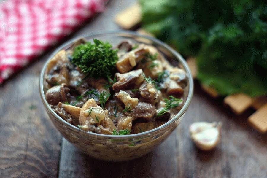 Сердечки из курицы с грибами с соусом и чесноком