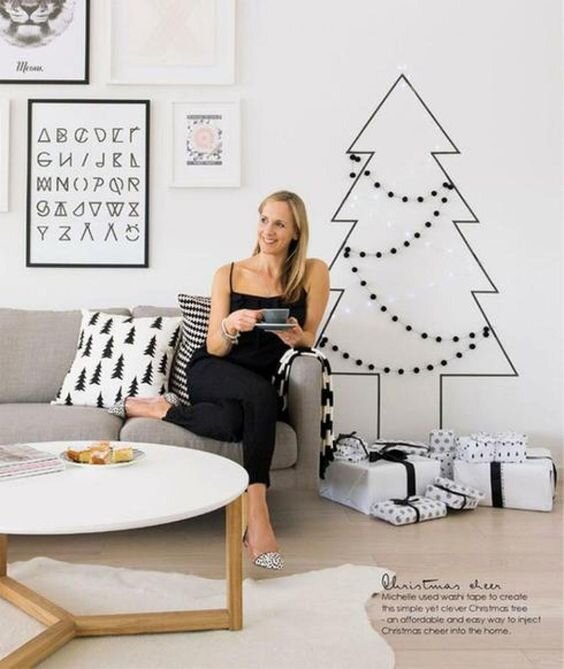 Настенная елка может принять самый неожиданный вид! Самый простой вариант - сделать ее из декоративного скотча. Понадобится пара катушек и воображение. Посмотрите в нашей галерее варианты елочных контуров и схематичных рисунков, которые приклеиваются прямо на стену в любом удобном месте в квартире. Дополните образ маленькими флажками, гирляндами, шариками - скотч-елка от этого только выиграет!