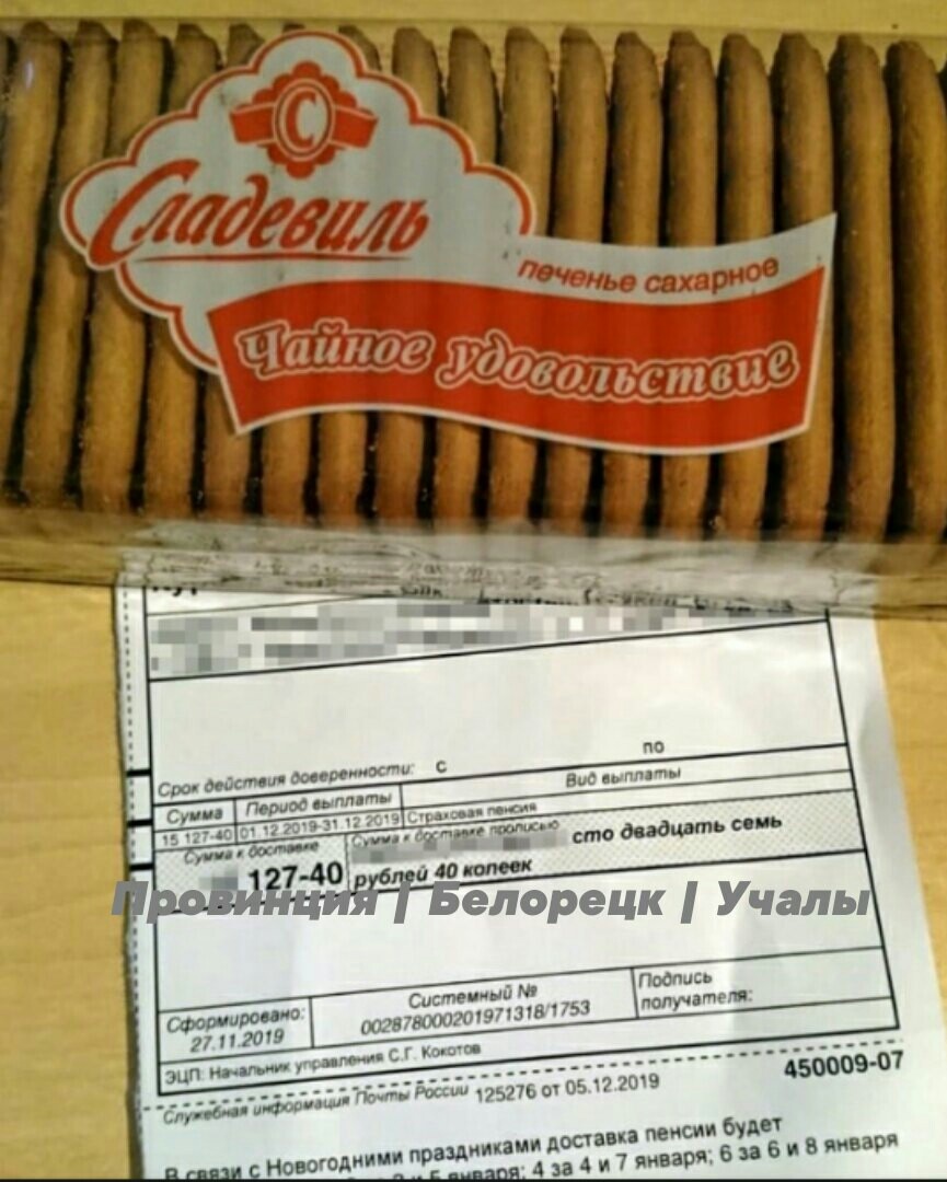 Всем привет. Прочел я о том что в Уфе пенсионеру часть пенсии выдали вот этим печеньем. Полез искать источник, и знаете что обнаружил? И в майловской статье, и в статье вк фигурирует бабушка пенсионерка. А в другой статье от UFA1.RU пенсионер уже мужчина, имя изменено, возможно он попал под програму о защите свидетелей. Ведь до него могут добраться злые почтальоны, которые получают в лучшем случае МРОТ, и вынуждены торговать печеньем, дабы получить бонусы к зарплате. Осталась неизменной лишь пачка печенья, имя дочери и сумма пенсии. Кстати, на квитанции нет росписи получателя. Зато есть электронная цифровая подпись начальника Управления Пенсионного Фонда Российской Федерации в Советском районе г. Уфы. Ему журналисты видимо постеснялись задать вопросы. Кстати UFA1.RU заявляет, что в пресс-службе «Почты России» по РБ UFA1.RU сообщили, что информация о выдаче пенсии пачкой печенья не может быть правдой. Однако пообещали проверить этот факт, если корреспондент отправит запрос в в