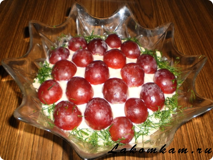 Верх салата украшаем половинками винограда. Приятного аппетита.
