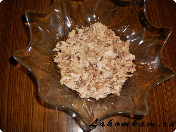 Приготовление салата «Виноградная лоза». Подготавливаем продукты и укладываем слоями в салатник, каждый промазывая майонезом: разобранное на волокна куриное мясо,
