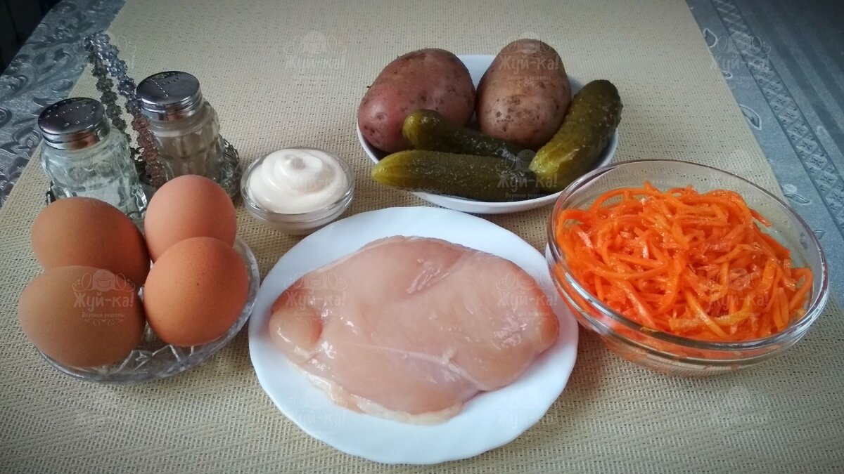 Новый год уже завтра! Если вы ещё не определились какие салаты будите готовить, то статья для вас! Хочу сегодня поделиться рецептом вкусного и простого салатика, который не стыдно поставить на новогодний стол. Буду рада, если он придётся вам по вкусу! С Наступающим!!!:) Способ приготовления: Куриное филе отвариваем в подсоленной воде до готовности (после закипания воды варить 25-30 минут). На заметку: для удобства можно отварить курицу, картофель и яйца вечером, а готовить на следующий день. Итак, когда филе остынет - нарезаем его достаточно мелко и выкладываем в разъёмную форму для салата - это будет первый слой. Каждый слой, кроме последнего покрываем майонезной сеточкой: Вторым слоем выкладываем морковь по-корейски: Третьим слоем будет картофель. Его нужно предварительно отварить до готовности и натереть на средней тёрке. Картофель равномерно распределяем по моркови и немного перчим: Далее солёные огурцы нарезаем небольшими кубиками и раскладываем их на картошке - это четвёртый слой