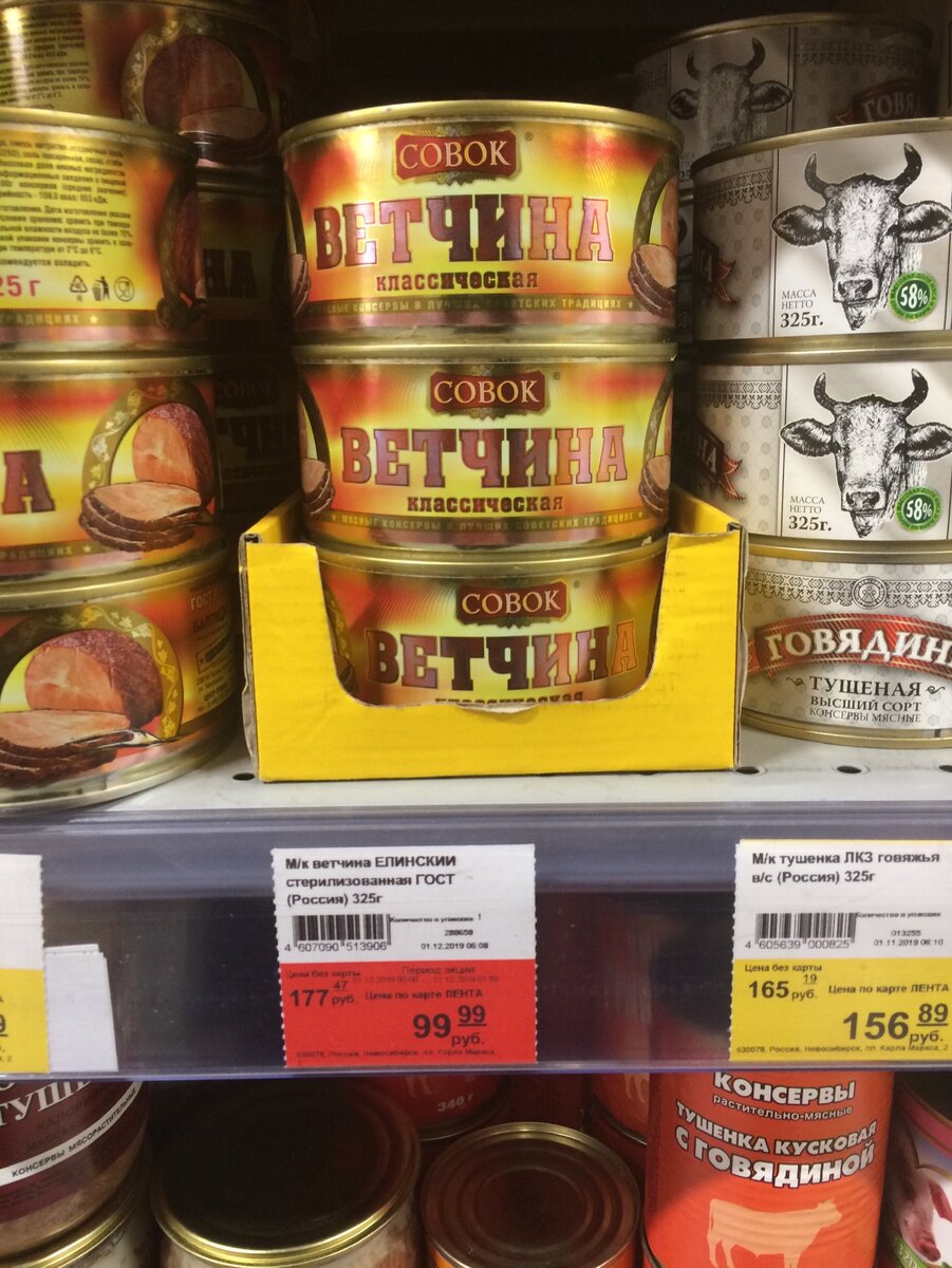 Привет! Сегодня 7.12.2019 я пошел в Ленту, чтобы поискать консервы по скидкам. А что из этого вышло, вы сейчас узнаете. Приятного изучения! 1) Ветчина классическая. 325г за 99 рублей. Скидка: 77.48 рублей 2) Шпроты в масле Лента. 240г за 115 рублей. Скидка: 31,2 3) Горбуша натуральная "Фрегат" 245г за 99.99 рублей. Состав: горбуша, соль. Пищевая ценность в 100г продукта: белки - 15, жиры - 1,5, углеводы - 0, энергетическая ценность - 75 ккал / 310 кДж. Скидка: 83,3 рубля 4) Горошек зеленый "6 соток" 425 мл за 44.89 рубля. Масса основного продукта: 240г Скидка: 36,1 рублей 5) Кукуруза HEINZ 340г за 48.89 рублей. Как уверяет производитель, эту кукурузу "сотворили" за 3 часа после помола. Скидка: 44 рубля 6) Маслины за 89.89 рублей (420 г) и оливки 79.89 рублей (300 г). Не планирую говорить про маслины марки "365 дней", но если вам интересно, пишите в комментариях и мы сделаем полноценную закупку этого бренда. А вот насчет оливок и маслин фирмы "Iberica" я могу сказать точно, это очень