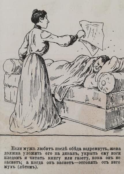 1️. Если муж любит после обеда вздремнуть, жена должна уложить его на диван, укрыть ему ноги пледом и читать книгу или газету, пока он не уснёт. А когда он уснёт - отгонять от него мух. ⠀ 2️⃣ Жена должна ожидать мужа у подъезда канцелярии перед окончанием занятий и провожать до дома. ⠀ 3️⃣ Чтобы муж не покушался обедать в ресторане, жена должна стараться сделать, чтобы ему было как можно приятнее обедать дома. После каждого блюда она должна вытирать ему рот и усы салфеткой и целовать его Если понравилась тема - ставьте лайк, пишите мнение в комментариях, подписывайтесь на мой начинающий дзен!