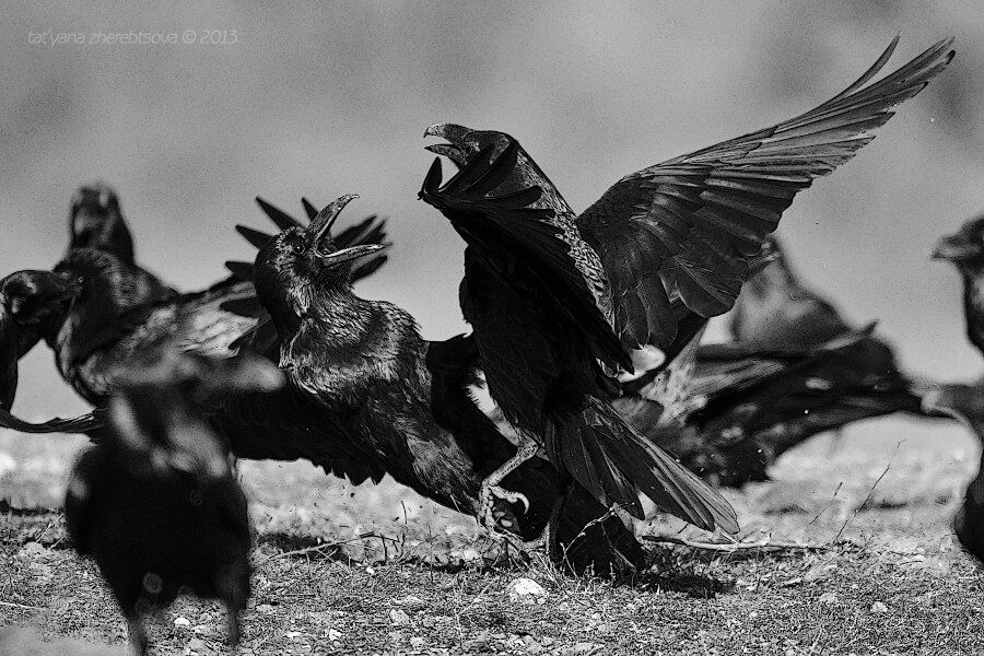 Судя по фотографиям может показаться, что во́роны частенько устраивают потасовки. Я бы так не сказала. Да, бывали дни, когда по ощущениям, прилетали разные "кланы" воронов и именно между ними и возникали конфликты. До этого, как собственно и после того, всё обходилось мирно. Только сорок гоняли.