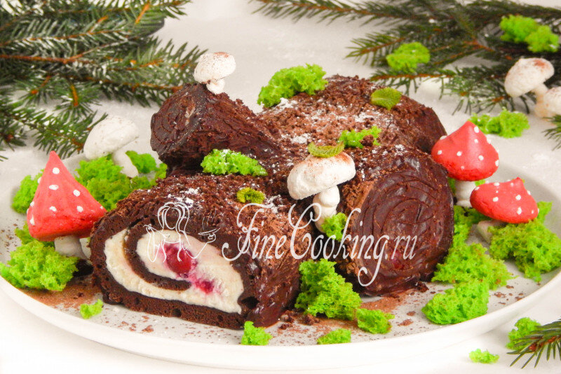 Относительно самого торта Рождественское полено. Вообще, это может быть совершенно любой рецепт, который при желании вы запросто составите сами. Бисквитный рулет, какая-нибудь стабильная начинка и шоколадная глазурь - вот и весь секрет. У меня торт получается насыщенно шоколадным, с нежным сливочным кремом и слегка кисловатой вишневой начинкой. Вы же можете приготовить простой белый бисквит или миндальный Джоконда, прослоить его белково-масляным, заварным или другим любимым кремом. Даже простые взбитые сливки - отличный вариант.