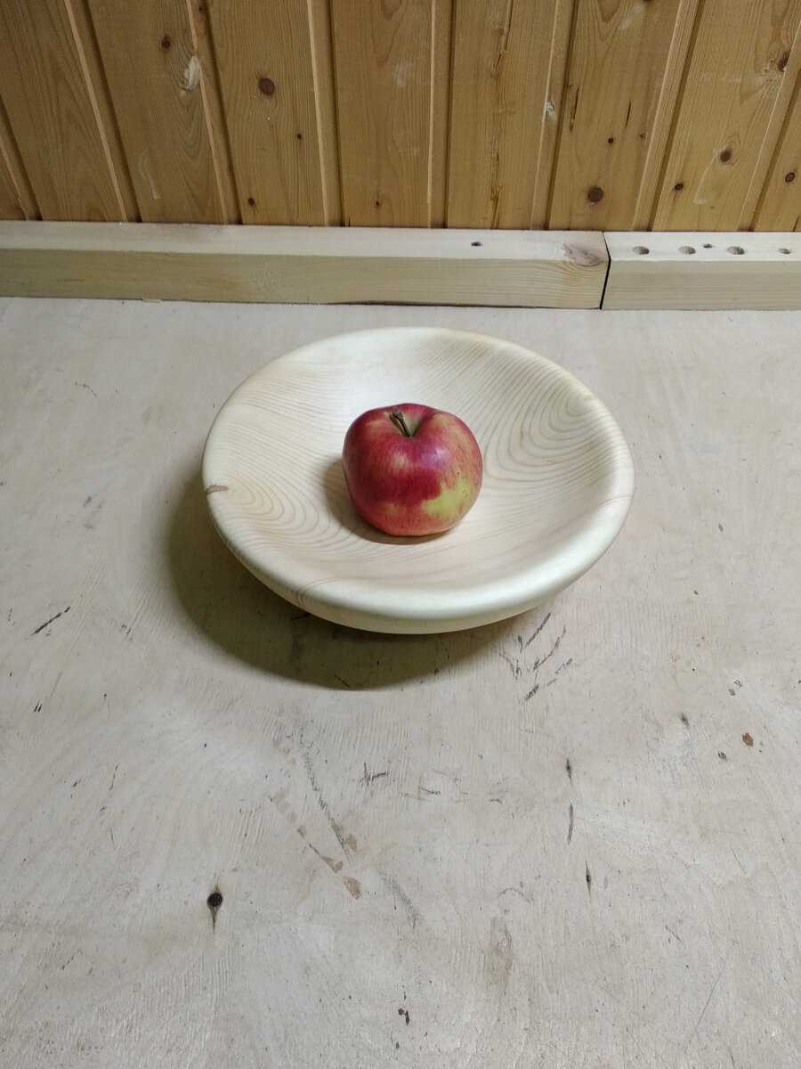 Сегодня буду делать тарелку из дерева. Обычно, такие вещи делаются на токарном станке, но я попробую сделать с помощью бензопилы, болгарки и орбитальной шлифмашинки. В качестве материала, буду использовать полубрус из сосны шириной 260мм. и толщиной 90мм. Он пролежал более 10 лет и хорошо высох. Выбираю кусок без трещин, сучков, смоляных карманов и размечаю внешний диаметр. С помощью бензопилы ( stihl 170), придаю заготовке полукруглую форму. Отступаю от края 20мм. и выпиливаю углубление, кончиком шины на максимальных оборотах бензопилы. При этом, с цепи летит масло и пачкает заготовку, но ничего страшного в этом нет, так как потом всё будет шлифоваться. Устанавливаю на болгарку лепестковый диск диаметром 125мм., зерном 80 и сглаживаю все неровности после бензопилы. Шлифую орбиталкой с зерном 80, затем 150. Финишную шлифовку делаю руками, шлифовальной бумагой с зерном 320. Готовую тарелку пропитываю горячим льняным маслом с добавлением пчелиного воска ( на 3 части масла - 1