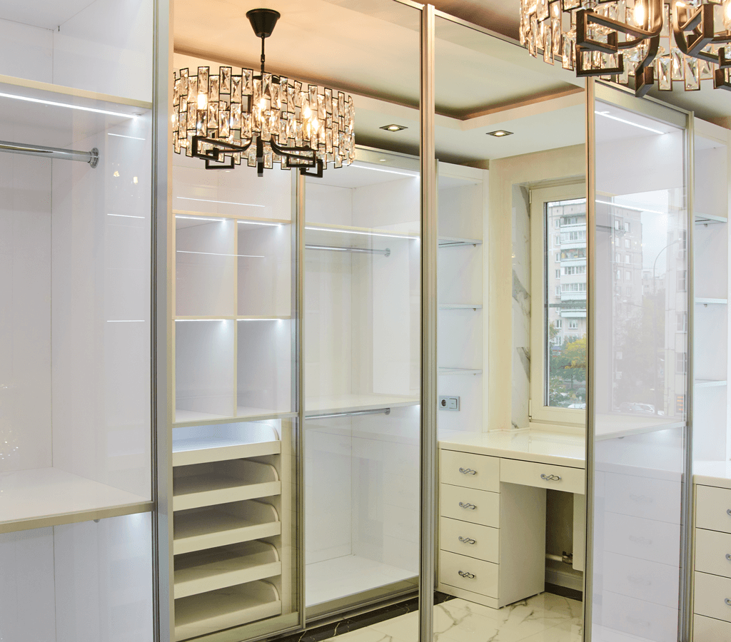 Необходимым атрибутом современного дома является гардеробная, которая позволяет упорядочить любые предметы семейного гардероба, быстро найти желаемые галстук или шляпу, сумочку или туфли. Этот проект интересен тем, что у молодой и активной семейной пары, уже готовившейся к переезду в новую квартиру, возникла необходимость сразу в двух гардеробных комнатах. Специалисты компании Matrix предложили лучший вариант решения с учетом компактности и функциональности, с разнообразным внутренним наполнением и достойным внешним оформлением. Первая гардеробная – малая – с входом из спальни предназначенная для повседневной одежды и белья, а вторая – большая – с отдельным входом, в которой должно быть достаточно места для нарядной и верхней одежды, обуви, головных уборов, сумок и других аксессуаров. Особое оформление этой светлой комнаты с окном позволило не только сделать ее удобной для хранения вещей, но и любимым местом хозяйки. Малая компактная гардеробная выполнена без фасадов с боко