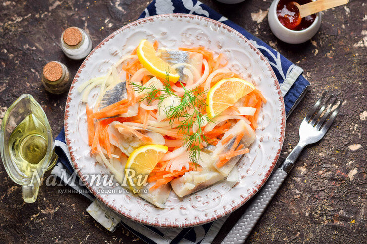 Ингредиенты: - сельдь – 1 шт.; - морковь и лук – по 1 шт.; - сахар – 3 ч.л.; - соль – 3 ч.л.; - лавровый лист и перец горошком – по вкусу. 🔪Очистить и сполоснуть лук, нарезать тонкими полукольцами 🥕Морковь очистить и сполоснуть. Натереть на средней терке 🐟Сельдь очистить от внутренностей, удалить кости и хребет. Нарезать небольшими порционными кусочками 👉🏼Выкладывать в банку слои – селедка, морковь, лук, ч. л. сахара и соли, немного лаврового листа и перец горошком ❄️Прикрыть банку капроновой крышкой, поставить в холодильник на сутки https://namenu.ru/11594/Seledka_po-gollandski/