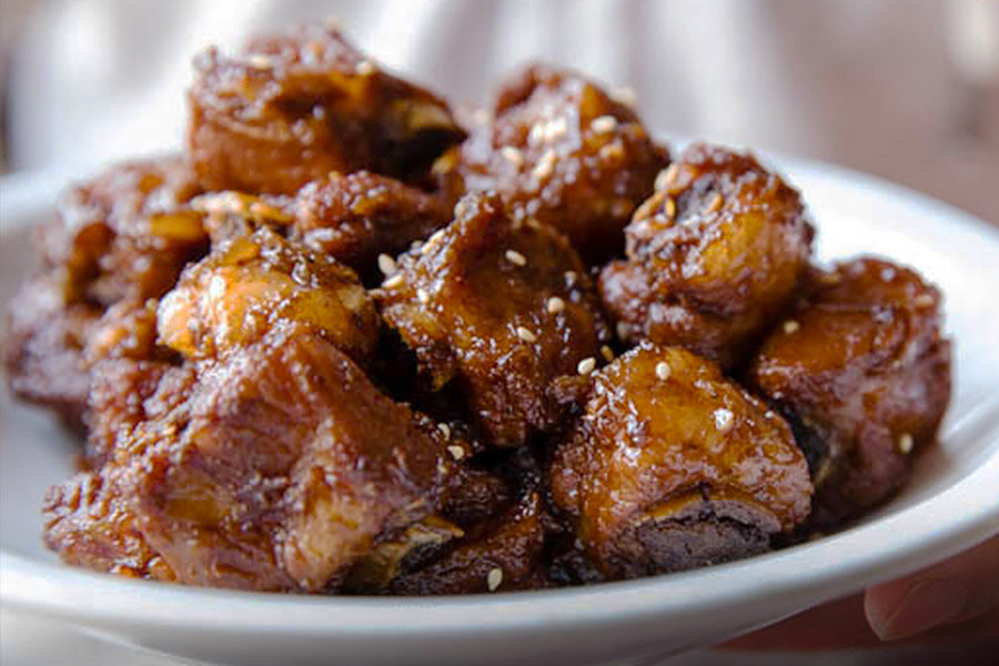 - Снимите крышку и прибавьте огонь. Загустите соус, пока не появятся большие пузыри. Добавьте оставшийся рисовый уксус, хорошенько перемешайте и снимите с огня. Подавайте ребрышки горячими присыпав кунжутом. Готово.