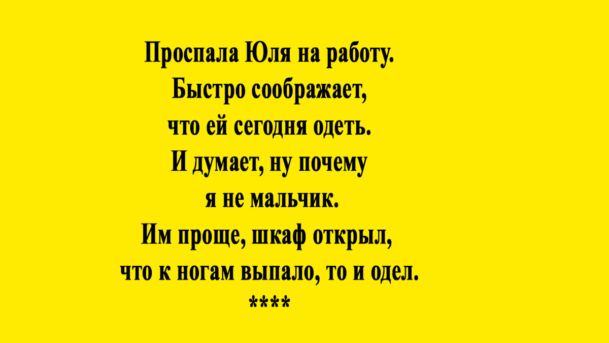 - Ох девочки, какая я не постоянная! - Почему? - Не могу определиться за кого выйти замуж. Вот утром сижу перед зеркалом и думаю, надо выходить за пластического хирурга. В обед – хочется в мужья повара. А вечером и за массажиста не прочь выйти… **** Утор. Офис. - Наташа, ты чего с нами чай не пьешь с пироженками? - С мужем поспорила, что за две недели сброшу пять килограмм, на золотые сережки. Обеденный перерыв. В офисе приятный запах кофе с бутербродами. Наташа подходит к зеркалу и говорит: - Ну вот не идет мне золото, ну не идет… **** Проспала Юля на работу. Быстро соображает, что ей сегодня одеть. И думает, ну почему я не мальчик. Им проще, шкаф открыл, что к ногам выпало, то и одел. **** Жена на мужа кричит: - Вещи где попало валяются, носки на полу раскиданы. Он говорит: - Милая, а ты не слышала новую акцию объявили: «Кто соберет пять пар носков, тот получит деньги на помаду.» **** Поругались с мужем. Спать легли, как водится, подальше друг от друга. А я лежу и думаю: «Госпо