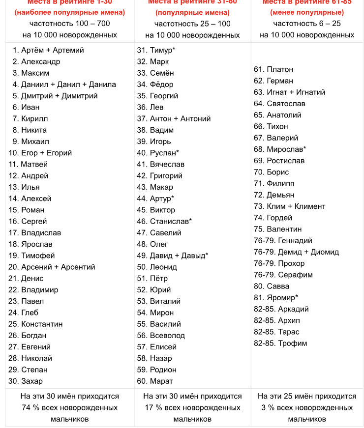 Все имена разбиты на пять условных групп: наиболее популярные (1-30 место), популярные (31-60 место), менее популярные (61-85 место), редкие и очень редкие имена. Такая классификация является практически удобной и наглядной. Количественные данные приведены к единому знаменателю – на 10 000 новорожденных. Чтобы лучше «почувствовать» цифры, укажем, что ежегодно в Москве рождается примерно 70 000 мальчиков, а во всей Воронежской области за год их рождается почти 13 000. ПОДПИСЫВАЙСЯ НА МОЙ КАНАЛ И МЫ ВМЕСТЕ БУДЕМ УЗНАВАТЬ НОВОЕ ТАК ЖЕ ВЫ МОЖЕТЕ НАЙТИ ДРУГИЕ ИНТЕРЕСНЫЕ СТАТЬИ НА КАНАЛЕ И ПОМНИ "Я ТВОЯ ЛАМПОЧКА В СФЕРЕ ЖИЗНИ"