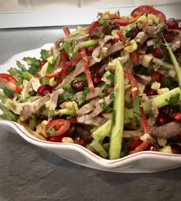 Это необыкновенно вкусный и пикантный салатик с оригинальными, изысканными нотками и, главное, без майонеза. Готовится очень быстро. Если язык уже отварен - на его приготовление вы затратите не больше 15 минут. Нам понадобится: Готовим: Язык, огурцы, сладкий перец, очищенный от семян, нарезаем соломкой, белый лук - полукольцами. На сухой сковороде поджариваем горсть грецких орехов. Затем нарубим их ножом (не мельчить в крошку). Готовим заправку: смешиваем соль, чёрный перец, перец чили и оливковое масло. В глубокую миску, в которой вам будет удобно перемешивать, соединяем язык, огурцы, сладкий перец и лук. Добавляем зерна граната, измельчённые грецкие орехи и зелень. Заправляем салат приготовленной заправкой. Оригинальный, насыщенный разными вкусами, без майонеза, яркий салат готов. Приятного аппетита. А чтобы не пропустить новые вкусные рецепты, подписывайтесь на мой канал. И ставьте - ставьте мне лайк, жмите на кнопку «Подписаться» - вам «плюсик» в карму и мне хорошо. А вам вернё