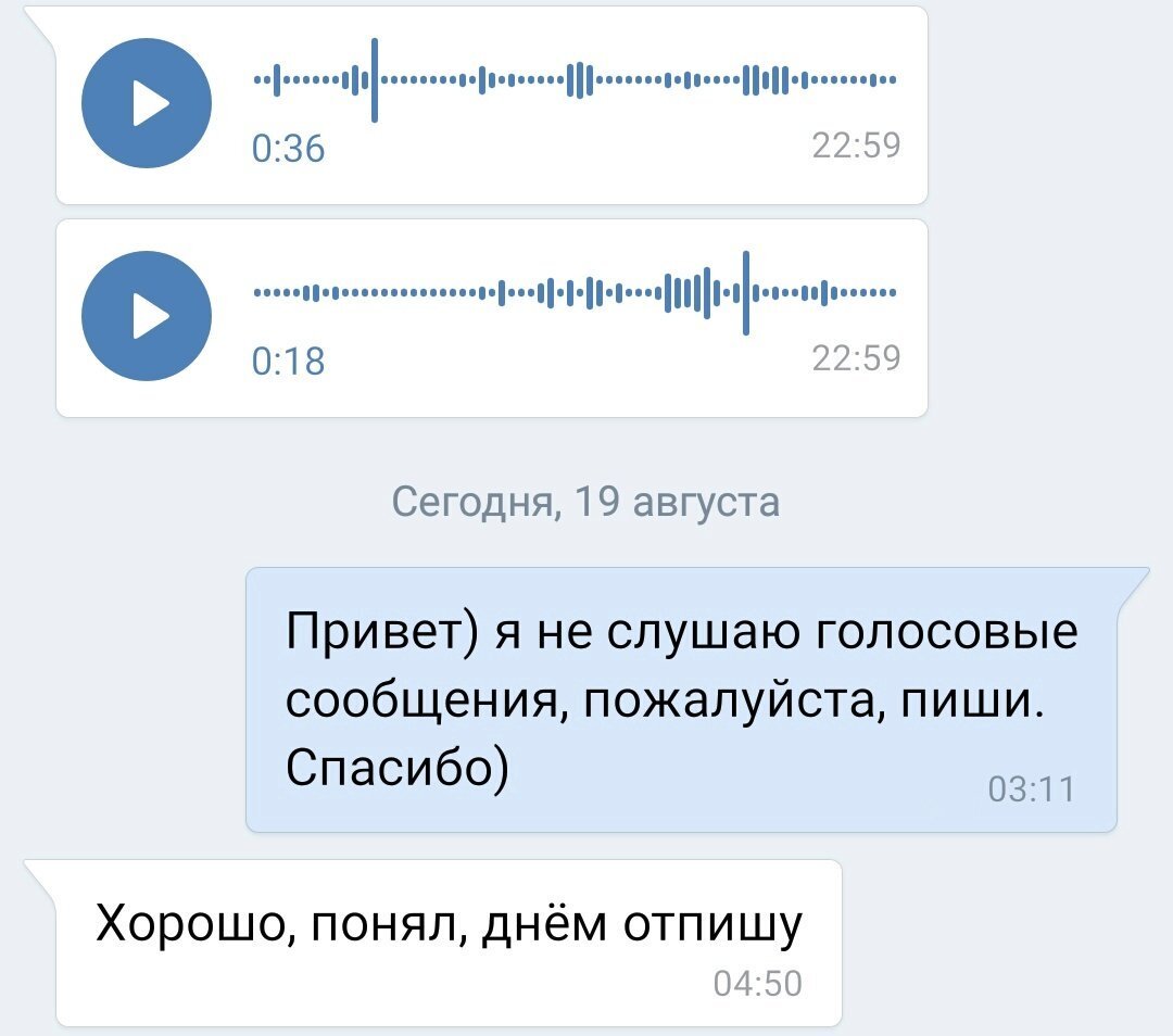 Общаетесь в тексте - не нужен голос. Принять правила игры - это высказать уважение к собеседнику. Правда работает это только с малознакомыми людьми или с кем по работе регулярно, но редко происходит общение. Подобное - подобным. Хочешь поменять "правила игры" - спроси собеседника. Совершенно не могу так поступать по отношению к коллегам. Ты знаешь их стили общения и если их собрать в одном (воображаемом) коллеге, то это будет самый лютый сотрудник. Давайте по-порядку: 1. Любитель голосовых сообщений. Особый вид коллег. Непривычно такое потреблять; невозможно потом искать эту информацию; размазывают реплику в 4 слова на 2 минуты сообщения. Возможно, стоит самому себе установить лимит сообщений - 1 сообщение в месяц от человека. Больше не надо. 2. Любитель упрекать в том, что я не проверяю почту каж