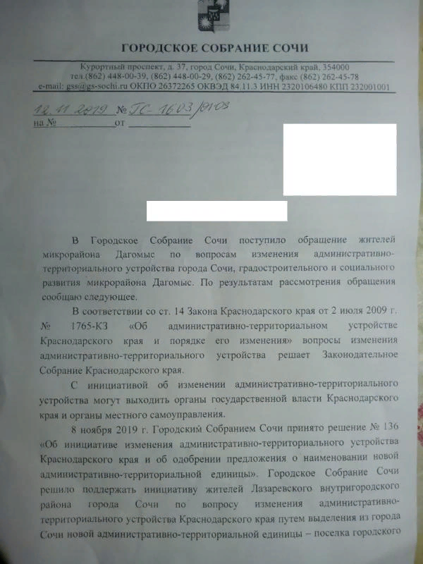 28.10.2019 на личном приёме председателя ГСС Филонова В.П. было передано обращение жителей микрорайона Дагомыс, а также в устной форме были переданы просьбы жителей о проведении схода в Дагомысе, а также внесе