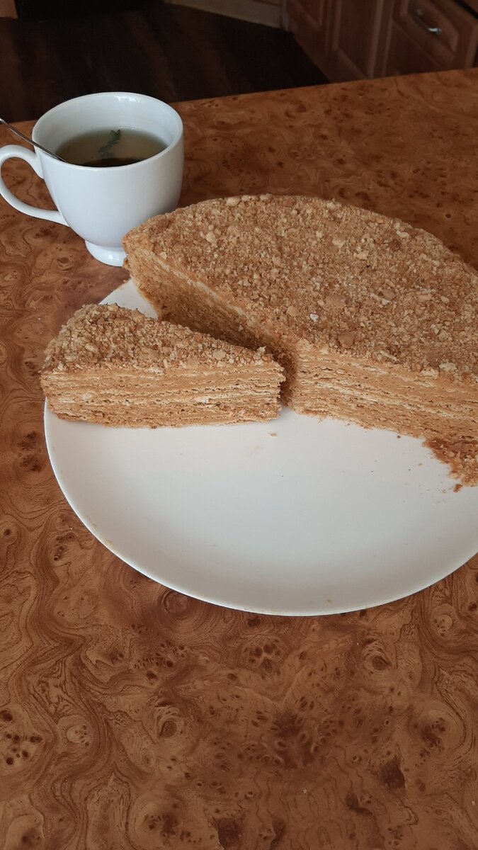 Добрый день мои дорогие подписчики и гости моего канала. Этот рецепт не относиться к пп, зато очень вкусно и если на праздник порадовать своих домашних таким тортиком, не чего страшного не случиться пусть будет такой себе чикмилк:) Именно с таким кремом мой любимый вариант медовика:) Для приготовления нам понадобиться: Тесто Крем Процесс приготовления. Сахар и масло растопить на водяной бане добавить мед и соду. Все время помешивать венечком, как только вся масса растопится, дать остыть и вбить 2 яйца, затем добавить муку и замесить тесто. Тесто делим на 8 частей и даем тесту отдохнуть в холодильнике 30 минут. Теперь разогреваем духовку до 200С., а тем временем раскатываем тесто, коржи должны получаться очень тонкими, форму я им придаю тарелкой большого диаметра, раскатала корж, приложила тарелку вырезала, остатки не выкидываем выпекаем вместе с коржом из них сделаем присыпку. Корж кладем на протвинь присыпанный мукой протыкаем вилкой и отправляем в духовку на 4 минут. Готовим к