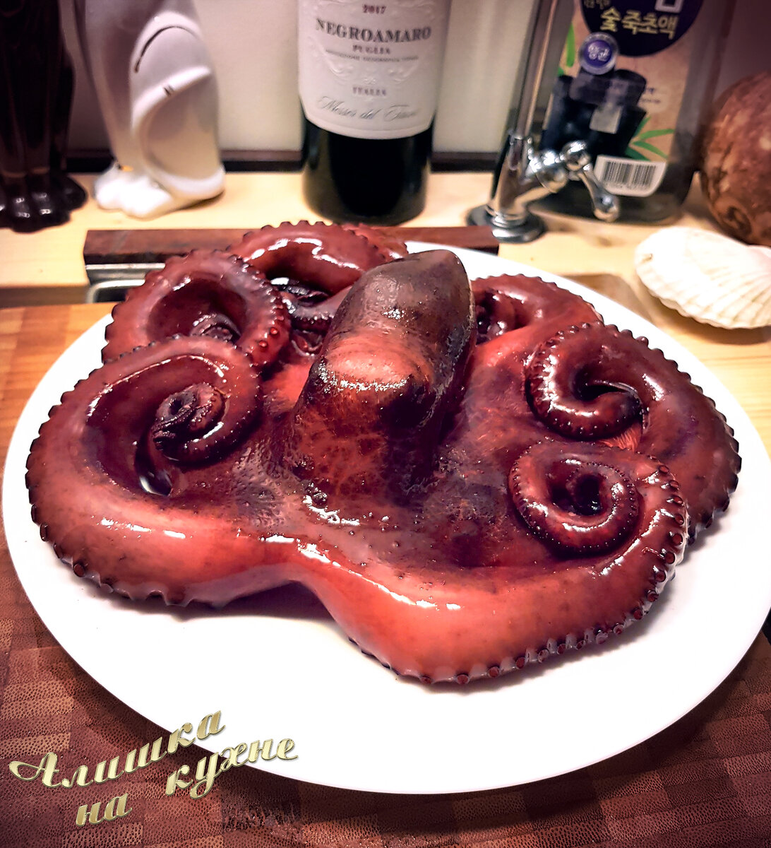 Оптимальный вес осьминога для приготовления целиком примерно 800-1200 г Крупнее не оправдано долго по времени готовки и шкурка уже за это время начнет слезать. Разморозить осьминога в холодильнике, чтоб не испортить шкурку. Помыть под холодной водой. Удалить клюв, глаза и потроха из головы если есть. Промыть присоски от песка, если есть Как себя ведет белок при варке. Вначале он схватывается температурой, белеет. Потом Он начинает сильно сжиматься становиться жестким. Дальше под действием температуры размягчаться. И так происходит с любым белком, будь то морепродукты (осьминог, кальмары, креветки...) или мясо. Поэтому при варке без специй можно использовать быстрый способ 5-7 минут. Если нравится чистый вкус продукта или для дальнейшего употребления в салате или с соусом. Для варки в специях и вине варим не меньше часа, для 1,5кг полтора часа, для 800гр всё равно не меньше часа. Мне нравится именно второй вариант. 1) Он ароматнее 2) он проще, т.к. с короткой варкой можно передержать