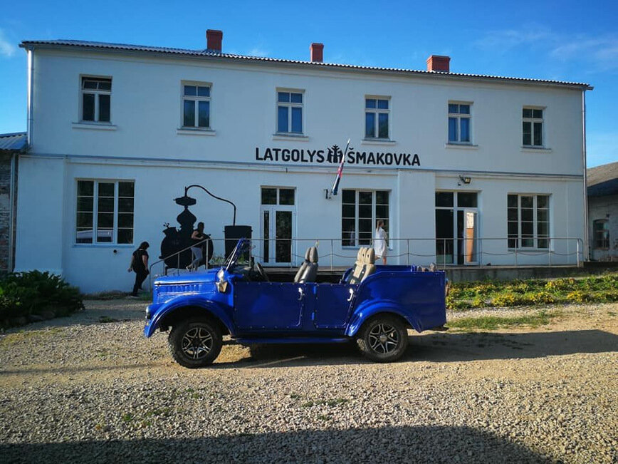 В небольшом латвийском городке Малнава находится производство известного местного горячительного напитка — шмаковка. Сегодня — это довольно популярное место среди туристов, а всех посетителей встречает вот такой любопытный внедорожник. Не дайте глазам обмануть вас: он лишь внешне выглядит, как самый обычный ГАЗ-69. От легендарного советского внедорожника тут лишь несколько деталей: капот, передние крылья и рамка лобового стекла. Вся задняя часть кузова сделана вручную. В качестве шасси использовали раму от японского внедорожника Nissan Terrano II середины 90-х годов. От него же позаимствован и интерьер, в частности приборная панель и рулевое колесо. Сиденья также, судя по всему, взяты от японского внедорожника. А на капоте появилась фигурка прыгающего ягуара, очень напоминающая те, что ставились на классические Jaguar. Задние фонари, судя по всему, от старенького Москвича-403.