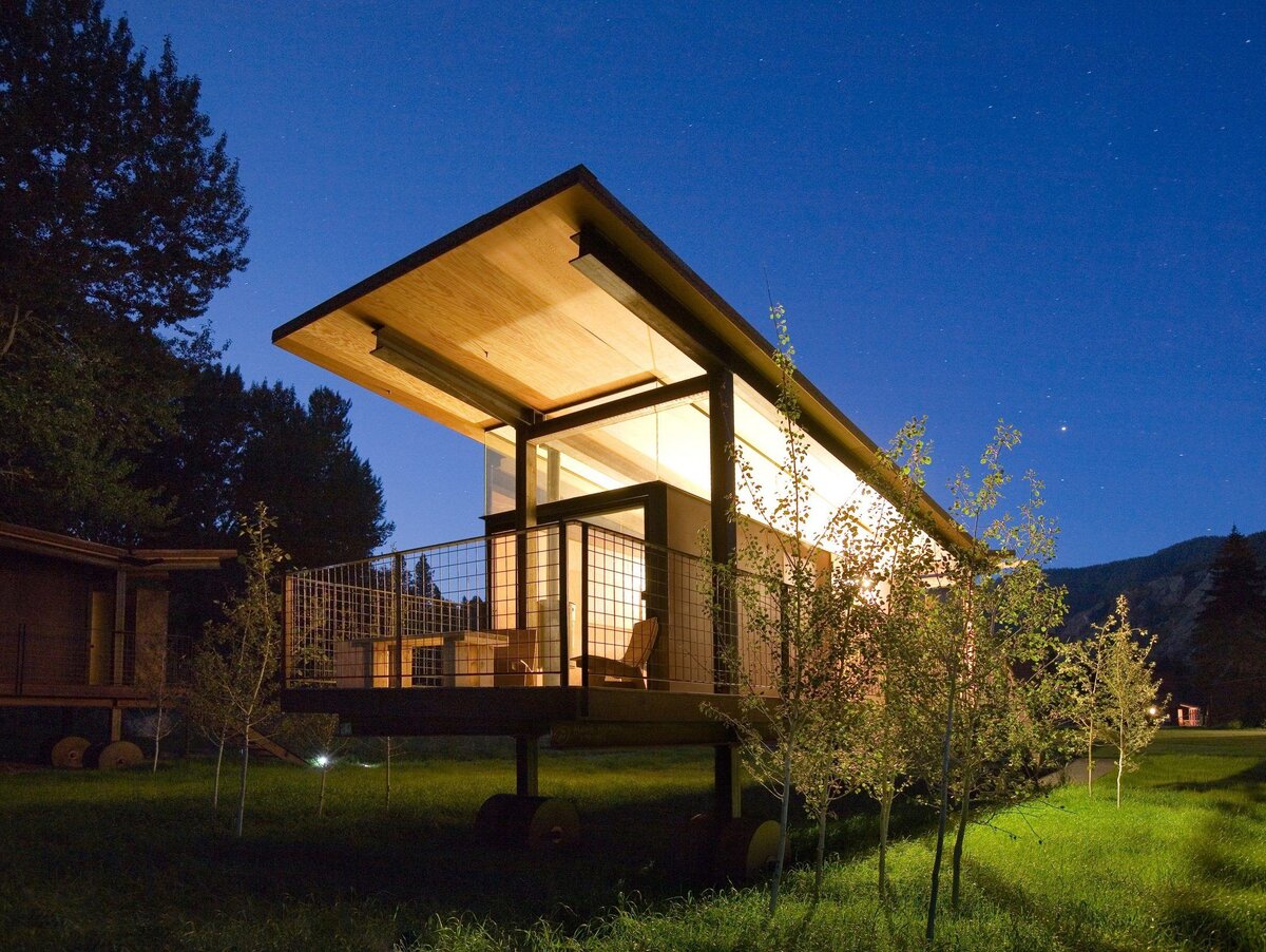 Расположенный в долине Метоу (Methow Valley), штат Вашингтон, США, Rolling Huts предлагает своим гостям размещение в нескольких уникальных эко-домиках на колесах. Спроектированные архитектурной дизайн-студией Olson Kundig, домики расположены так, чтобы любители природы смогли вдоволь насладиться прекрасным панорамным видом на окружающие горные пейзажи. Следуя последним тенденциям модного сегодня направления «glamping» («гламурный кемпинг»), домики предлагают простые и в то же время роскошные номера с минимальным воздействием на окружающую среду. Действительно, каждый домик отличается высокотехнологичным дизайном: стальной каркас, деревянная конструкция, большая стеклянная стена от пола до потолка, которая выходит на внутренний дворик-патио. Интересная особенность –верхняя часть стен по всему периметру также сделана из стекла, позволяя постояльцам наблюдать звездное небо, не выходя из комнаты. Весь домик расположен не на земле, а на колесной базе. При необходимости, его можно переместит