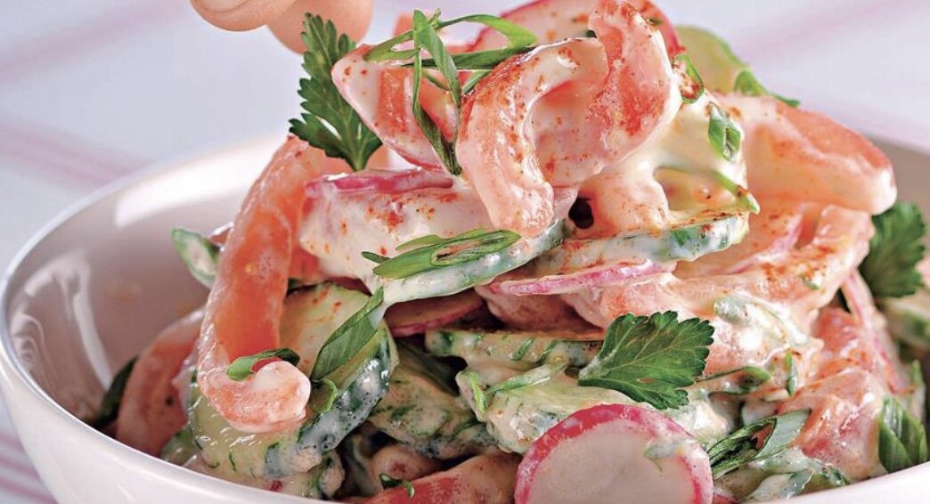 Теперь можно кушать салаты на празднике и не переживать по поводу веса, ведь этот салат низкокалорийный. Ингредиенты: • редиска 4-6 шт • огурцы 2-3 шт • помидор 3-4 шт • петрушка (по вкусу) • соль/ перец (по вкусу) Соус: • натуральный йогурт 1 стакан • зелёный лук (по вкусу) • щепотка карри Способ приготовления: Ваш вкусный и низкокалорийный салат готов