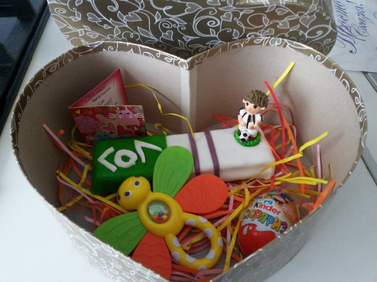 Это был волнительный момент. Летом этого года проходил Чемпионат мира по футболу. 7 июля играли Россия и Хорватия. Наши проиграли, муж расстроился, а на следующий день, в праздник семьи, я подарила мужу заветную коробочку / на фото вверху ленты. Говорю, не печалься, мы вырастим нового чемпиона. Так, муж узнал, что снова станет папой.