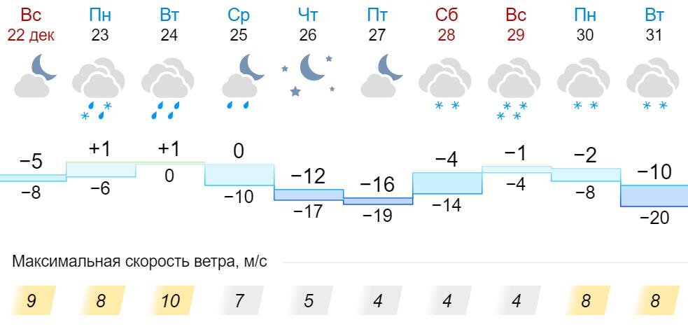 По прогнозу синоптиков, на рабочей неделе жителей Кировской области ожидает очередная оттепель, а после – морозы до -19°С. Так, в понедельник и вторник, 23 и 24 декабря, днем ожидается температура до +1°С. Вероятен снег с дождем и усиление ветра до 10 м/с. В ночь со среды на четверг температура начнет резкое снижение до -17°С. Днем в четверг, 16 декабря, температура опустится до -12°С, а в пятницу, 27 декабря, уже до -16°С. Осадков в эти дни не предвидится. Однако уже в субботу, 28 декабря, снова начнется потепление и столбики термометров днем остановятся у отметки в -4°С. При этом снова вероятны осадки в виде снега, которые усилятся в воскресенье, 29 декабря.